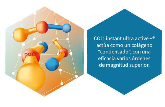El nuevo hidrolizado de colágeno tipo I y III tiene un perfil de péptidos favorable y un peso molecular medio ultrabajo de < 1000 Da. COLLinstant ultra active +® se comporta como un producto farmacéutico, con ingredientes activos, rápida absorción y resultados clínicamente probados, pero se toma como complemento alimenticio.